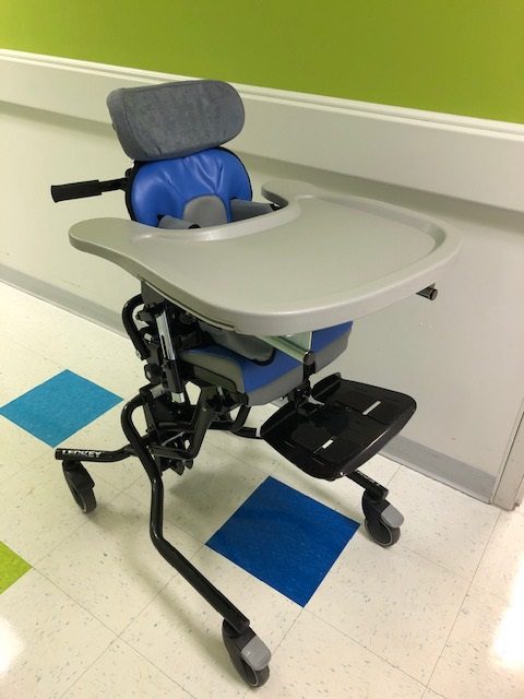 - pelvic stabilizer, chest strap, hip guides, lateral supports, headrest, high-low base with tilt, tray; like new condition