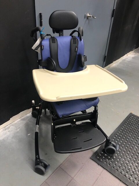 High-low base, hip guides, flat headrest,  chest harness, lateral supports, pelvic harness, adductors and tray, tilt and recline