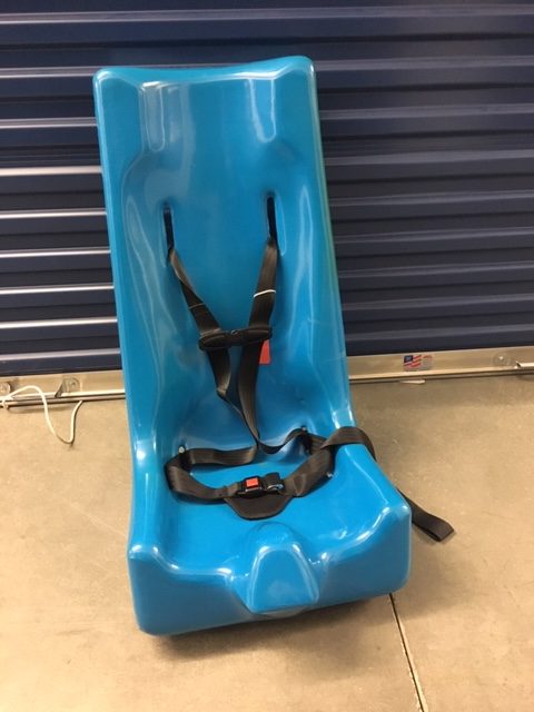 Contoured seat is 11 x 11 inches with 27″ high back. Completely new seat belt and chest harness. No base but can be propped against furniture.