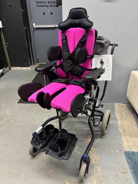 Transit, tilt, recline, seatbelt, hip guides, lateral supports, shoe holders with straps, headrest, chest harness, canopy (not pictured), large outdoor base with 12″ drive wheels and 8″ casters, adjustable hip abduction, no tray