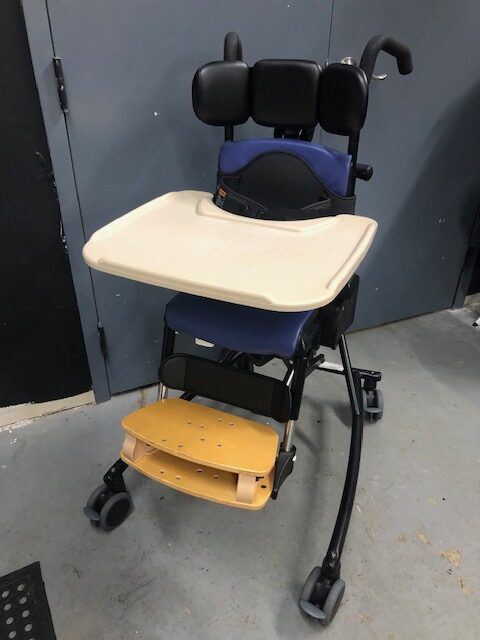 - seatbelt, chest strap, high-low base, tilt, recline, lateral supports, hip guides and headrest; tray, removable high mount foot platform