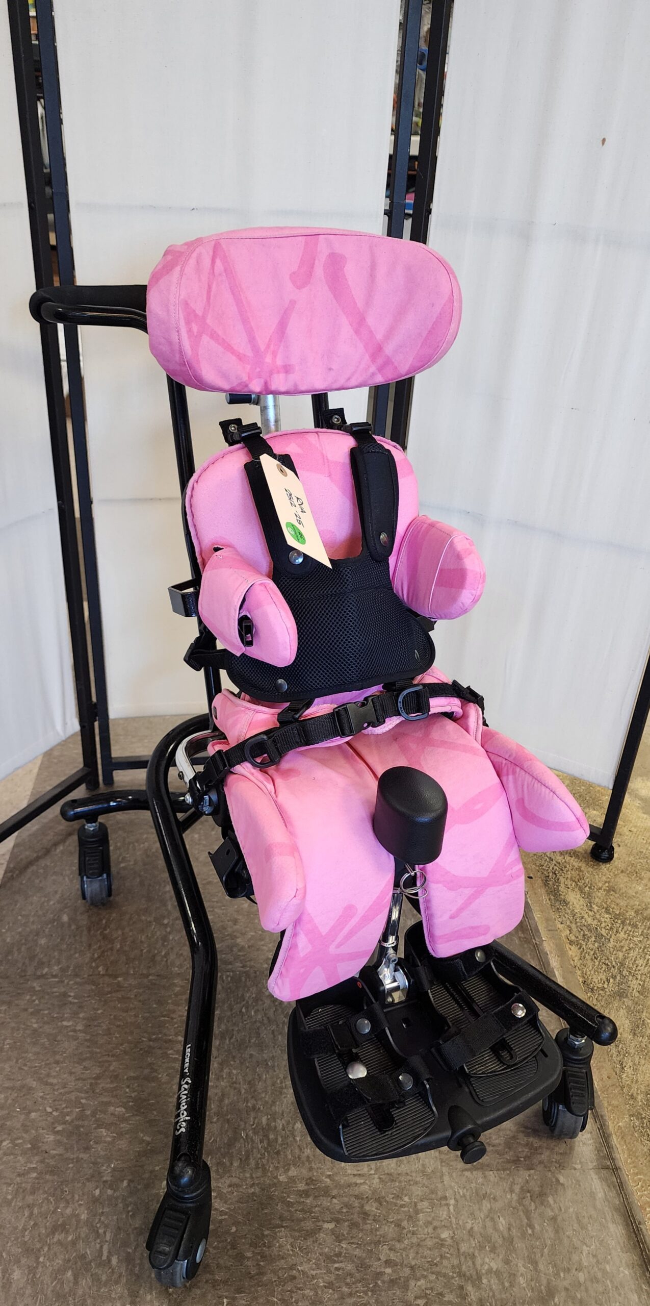 seat belt, hip guides, lateral supports, headrest, pommel, foot plates and strap. In good condition.