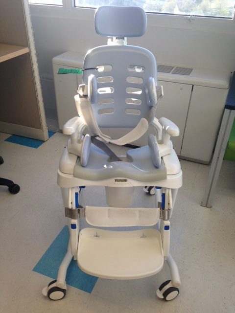 Tilt in space rolling base, open seat pad, headrest, pelvic stabilizer, removable bowl, lateral supports and chest strap; also has an abductor (not pictured)