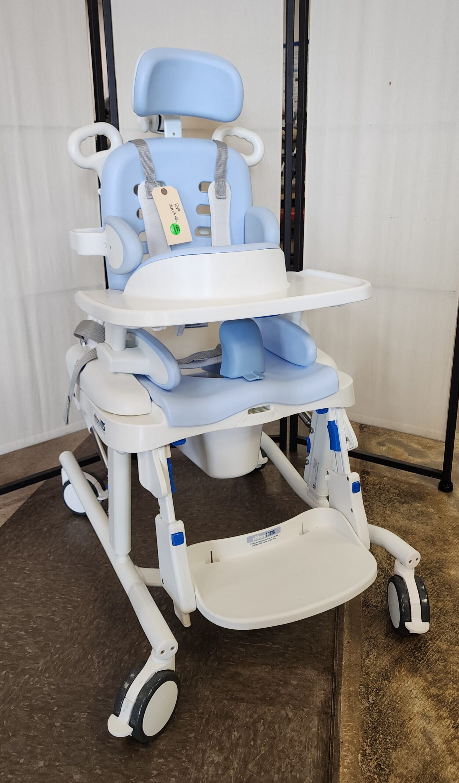 Butterfly harness, anterior support tray, lateral supports, headrest, foot board, tilt in space, hip guides, seat back pads, pan. In good condition.