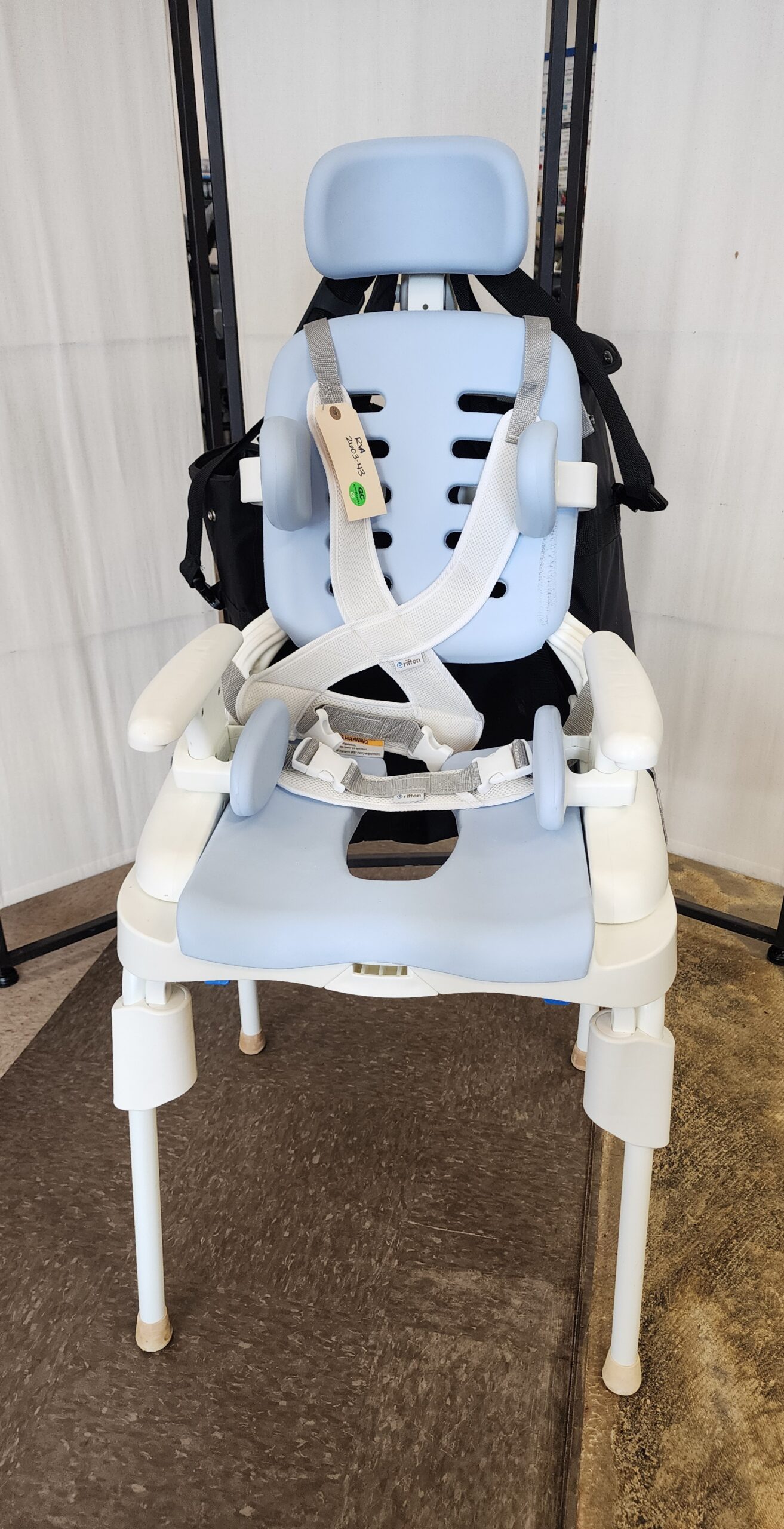 Seat belt, hip guides, lateral supports, headrest, butterfly harness, seat and back pads, arm rests, portability bag. In good condition.