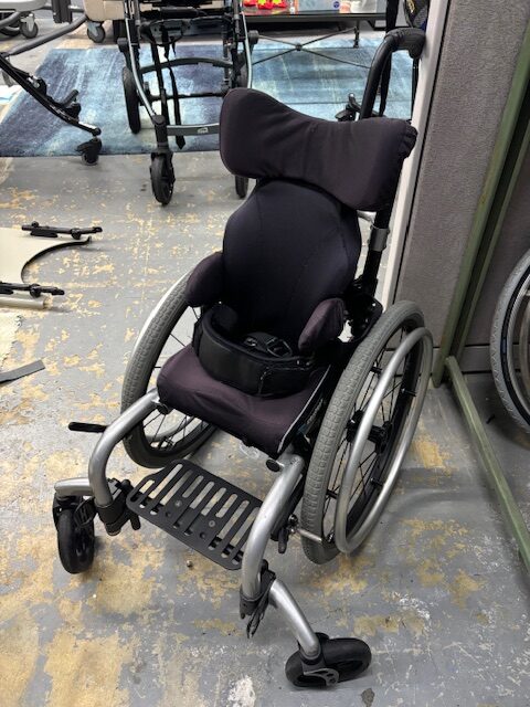 - Transit, flared front end with solid footplate, 5″ x 1.5″ casters, 20″ drive wheels (pneumatic tires-so these must be pumped up periodically), Inception cushion, Acta-back, Bodilink headrest, seatbelt, chest strap, push to lock wheel locks, 5th wheel anti-tipper, attendant push handle, no armrests