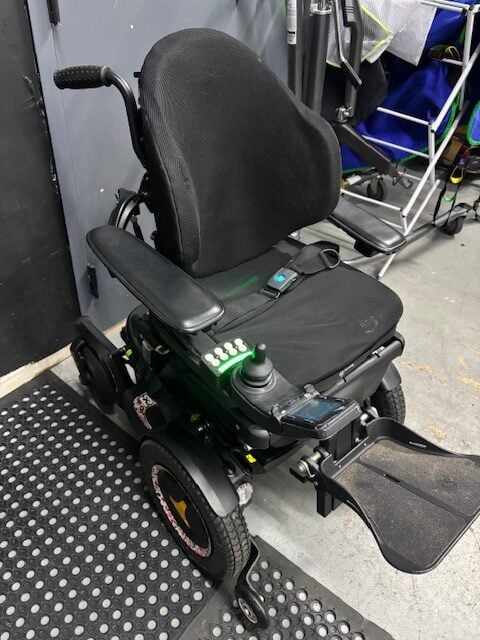 - Transit hooks, Axiom SP cushion, Roho Agility back with deep lateral supports, seatbelt, tilt, recline, power elevating legrest with single footplate, power elevating seat, 13″ arm pads, push handles, charger, joystick on the right, no headrest