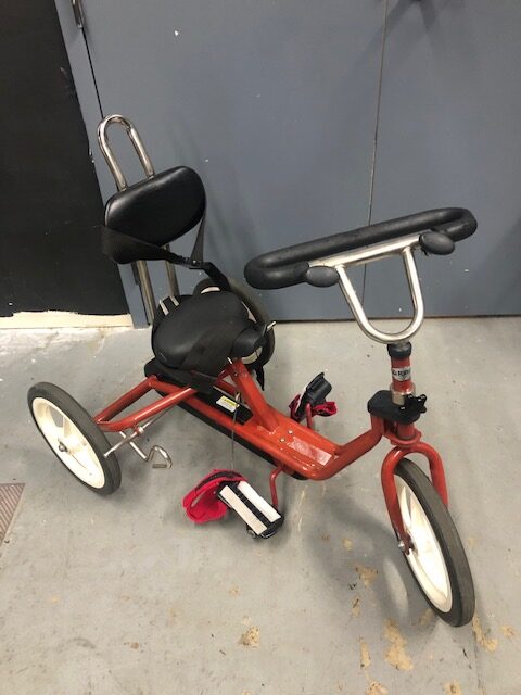 - seatbelt, low back, sandals, loop handlebars, chest strap; this is an older model tricycle