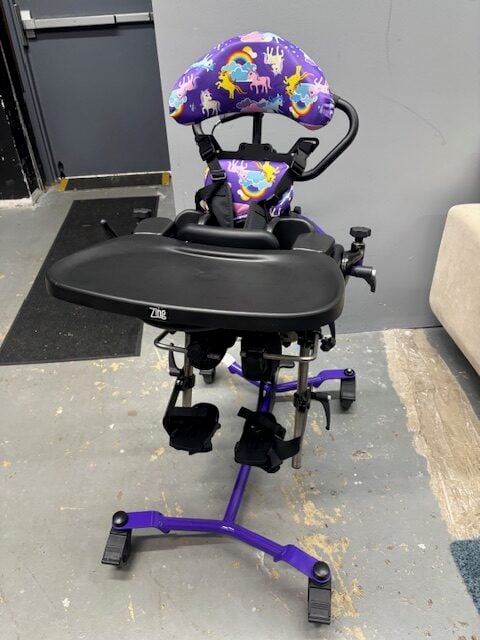 - seatbelt, headrest, chest strap, small sandals with straps, small knee blocks, no hip guides, lateral supports, tray, legs are adjustable in abduction; dual control, removable/washable unicorn covers