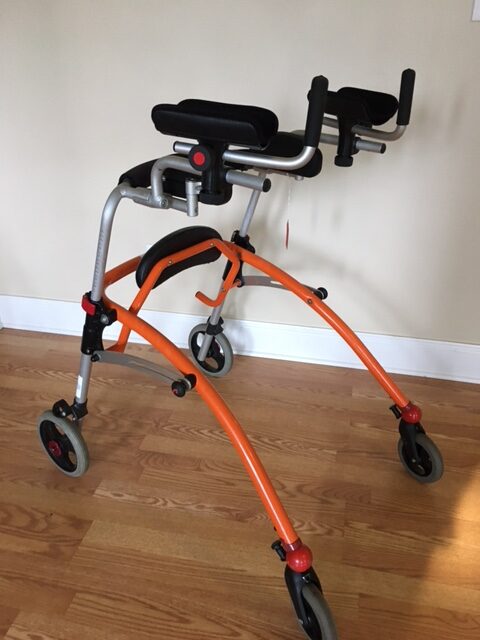 Medium to Large walker with forearm supports and fold down seat.  Max height to arm supports is 38″ and lowest is 31″