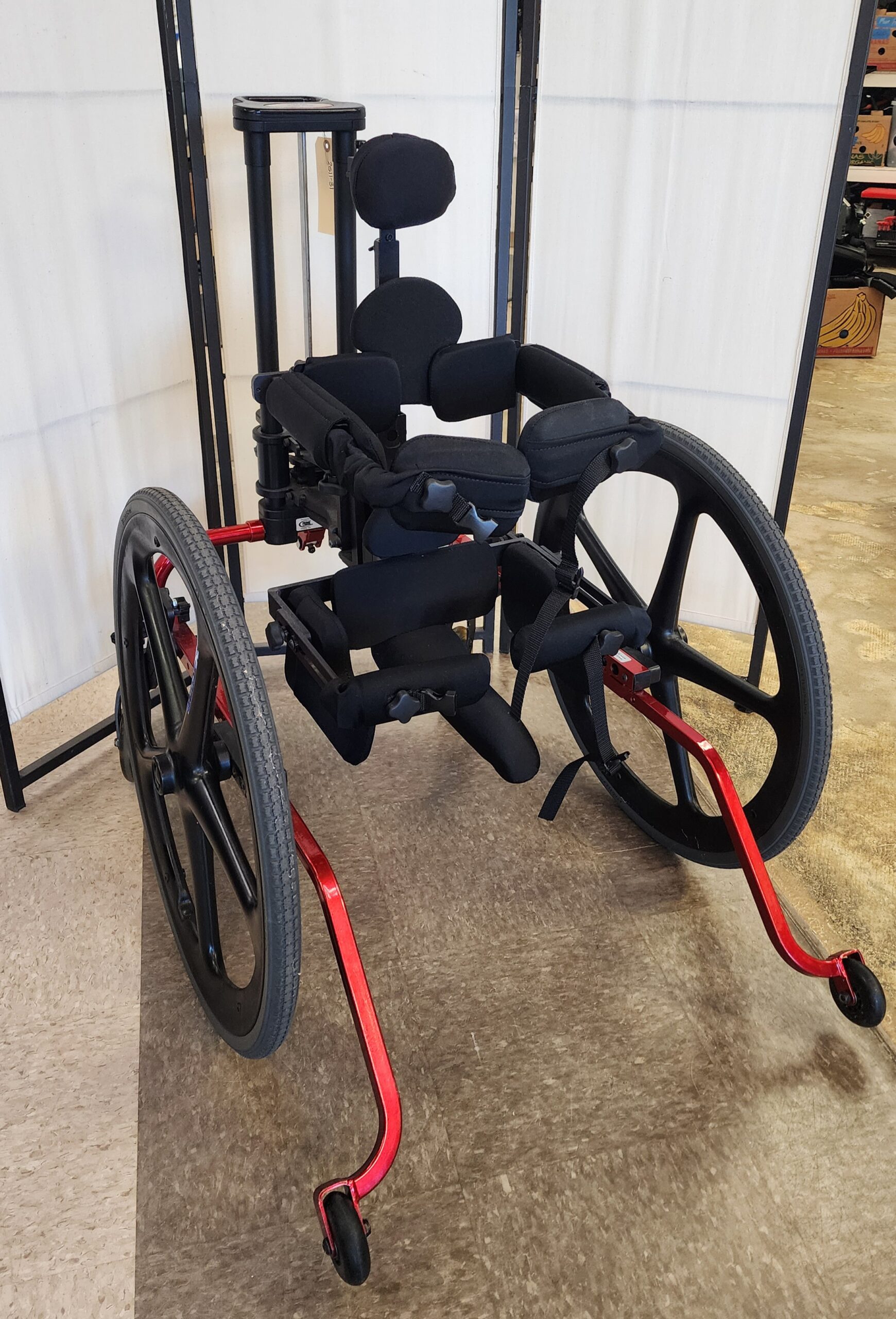 headrest, chest support system with flip ups, hip support system with flip up. In good condition.