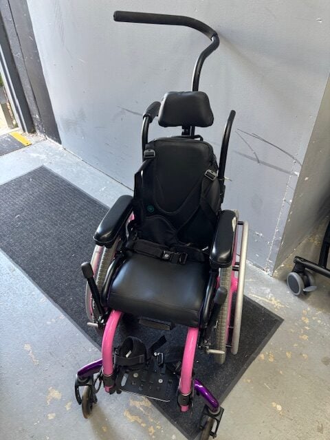 • Transit, 20″ drive wheels, 4″ light-up casters, fifth wheel anti-tipper, Ergo stroller handle, Acta-embrace cushion, Acta-embrace back, headrest, single post height adjustable armrests (one pad is torn), push to lock wheel locks with extensions, seatbelt, chest harness; push handle rubber grips do not match