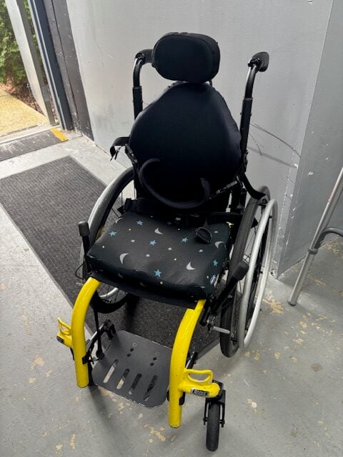- Transit, flip-up footplate, Matrix cushion, Axiom back, 22″ drive wheels, 6″ x 1.5″ casters, push to lock wheel locks with extensions, headrest, seatbelt, chest strap, anti-tippers, no armrests, no sideguards