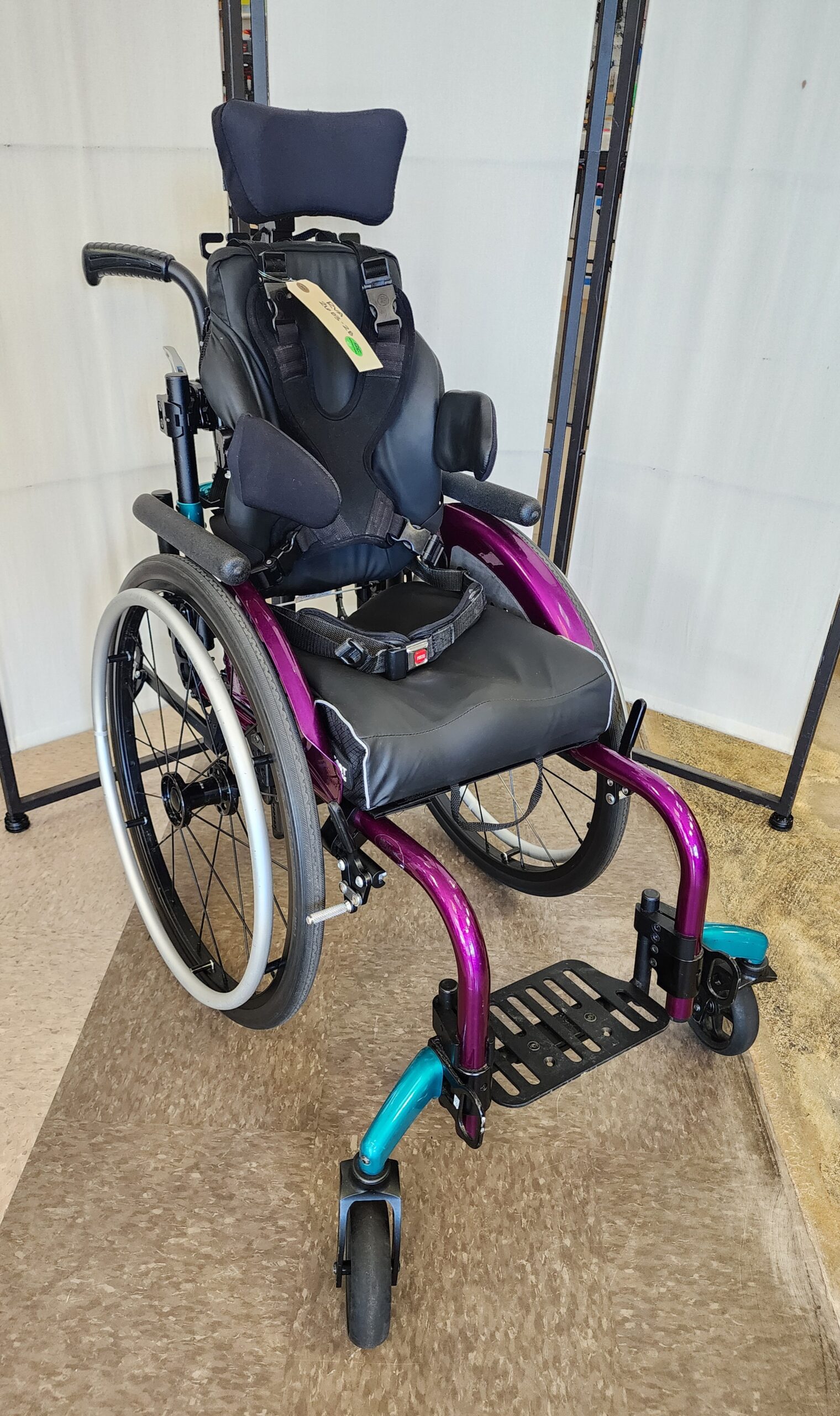 tie downs, seat belt, hip guides, headrest, chest harness, 5th wheel, 4″ & 3″ comfort seat cushions, swing away and removable arm rests, hand rims, wheel guides, double push handle. In good condition.