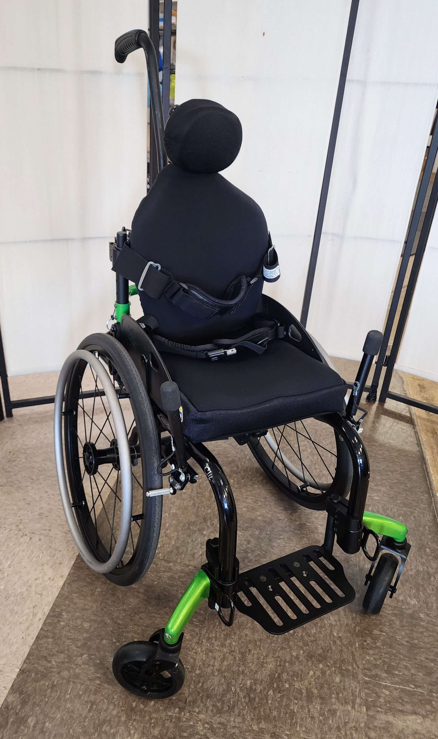 Transit, seat belt, hip guides, headrest, chest strap, attendant push handle, anti-roll back wheels, 2″ seat Jaye cushion. In good condition.