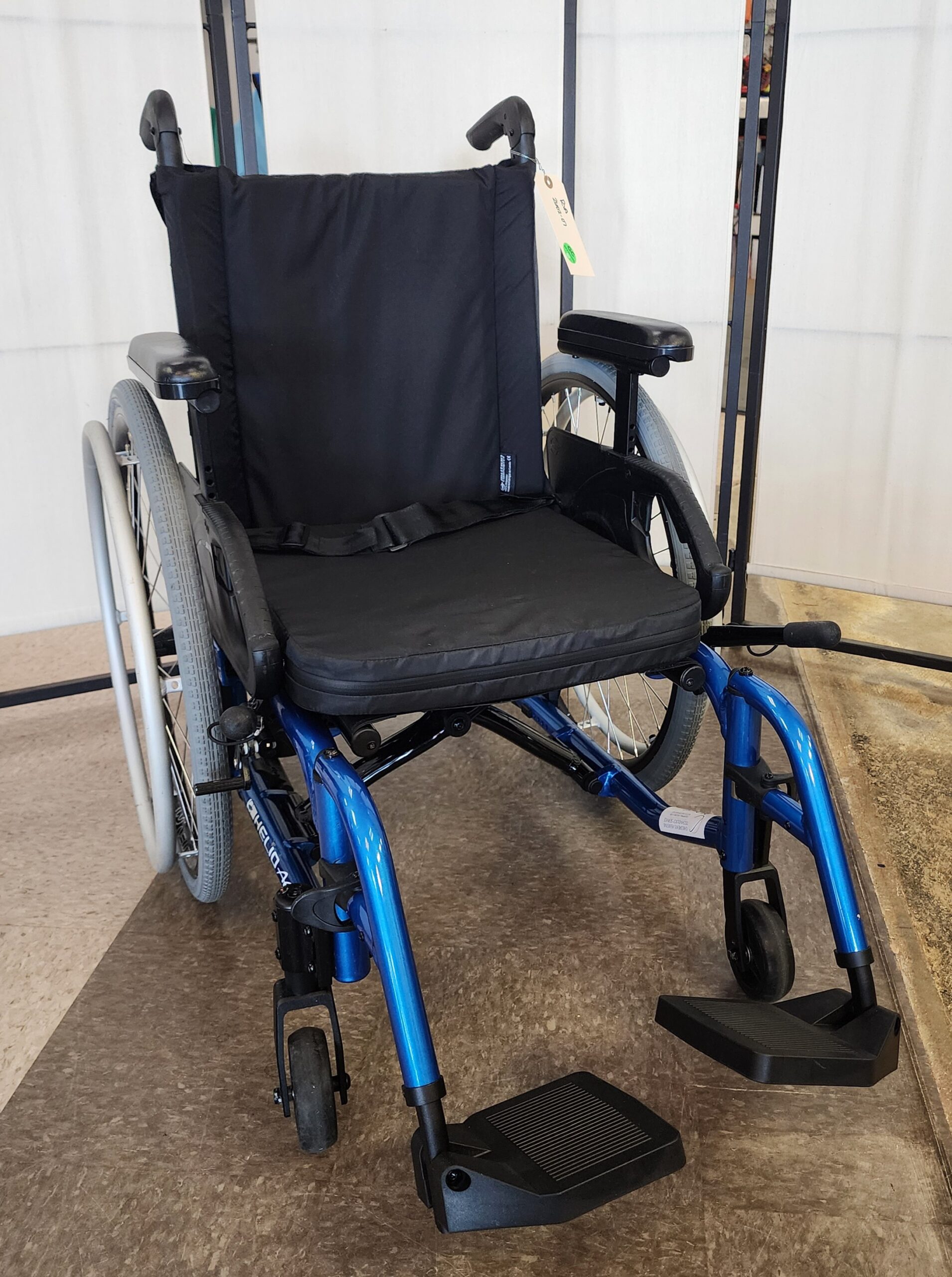 seat belt, 2″ seat cushion, height adjustable swing away armrests, push handle, crutch holder. In good condition.