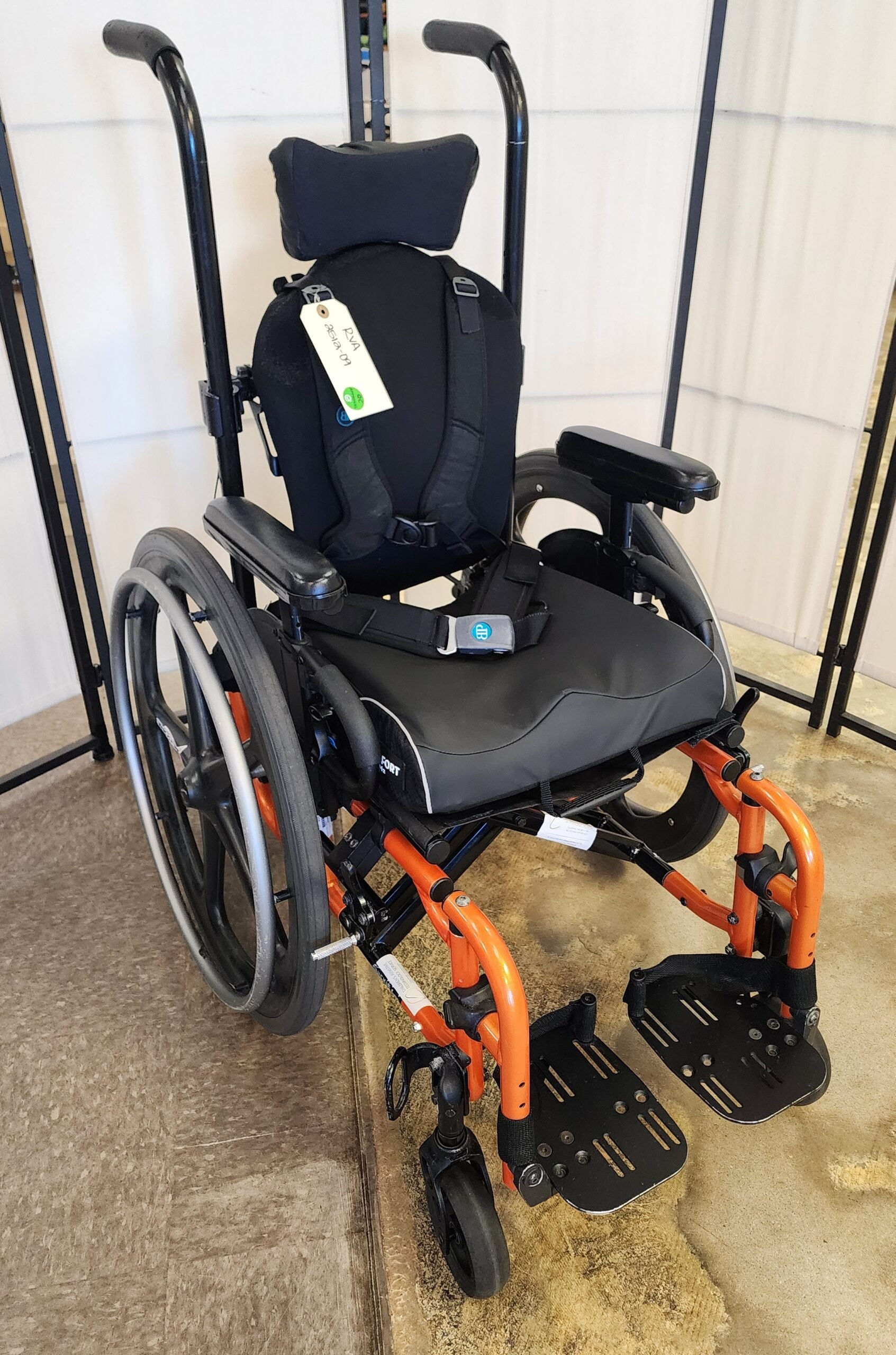 tie downs, seat belt, headrest, chest harness. In good condition.