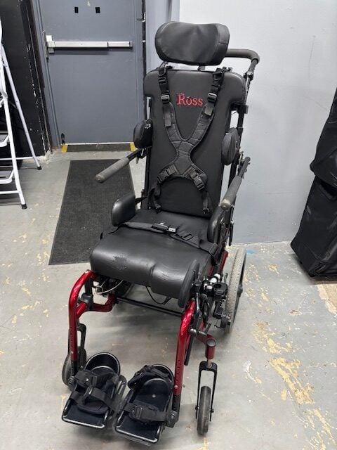 - Transit hooks, foot activated tilt, attendant wheel lock, anti-tippers, planar seating, headrest, lateral thoracic supports, hip guides, seatbelt, chest harness, left hanger mounted adductor pad, large shoe holders with straps, 16″ drive wheels, 5 x 1.5″ casters, worn upholstery, left armrest slightly lower than right