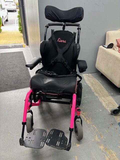 - Acta-Embrace cushion, Acta-Back deep with fixed lateral supports, chest harness, seatbelt, headrest, 8″ casters, 12″ drive wheels, anti-tippers, transit hooks, left armrest worn upholstery, foot lock