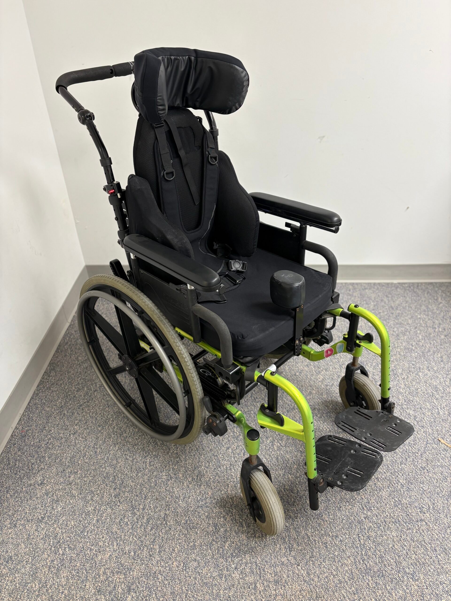 Transit, seatbelt, laterals, headrest, chest harness, anti-tippers, tilt, One arm lockout feature, abductor, flip away footrests, caregiver handle, brakes at front of chair