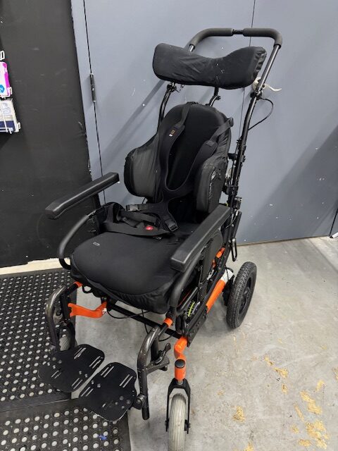 • Transit, hub locks, 8″ x 2″ casters, dual tilt handles, Jay Union cushion, Acta-Back deep back (tear at top of upholstery), Bodilink adjustable headrest, seat belt and chest harness,, anti-tippers, height adjustable armrests